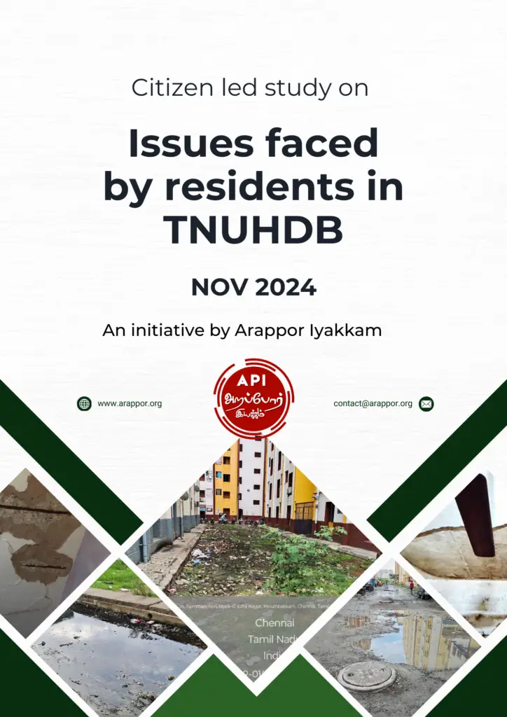 Arappor Iyakkam is an organization working towards Transparency and Accountability in Governance. We write this representation regarding the issues faced by residents of Tamil Nadu Urban Habitat Development Board who have been relocated from various parts of Chennai to buildings constructed by Tamil Nadu Urban Habitat Development Board (TNUHDB). These people face several issues due to the poor infrastructure in place. This requires immediate attention by the Government.